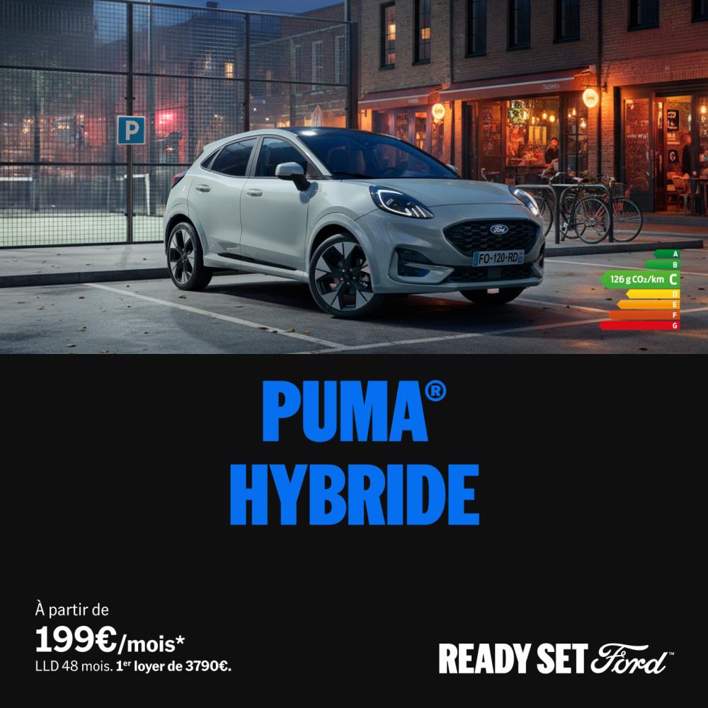 (1) Location longue durée (LLD) 48 mois/40000 km d'un Ford Puma Titanium neuf sans option. 1 loyer de 3790€ puis 47 loyers de 199€. Loyers mensuels exprimés TTC hors prestations optionnelles, malus écologique et certificat d'immatriculation. Restitution du véhicule en fin de contrat avec paiement des éventuels frais de dépréciation complémentaire et des kilomètres supplémentaires. Offre non cumulable incluant une aide à la reprise de 1 000 € sous conditions de reprise d'un nouveau véhicule, réservée aux particuliers du 01/03/2026 au 31/03/2026 en France métropolitaine et dans le réseau Ford participant, selon conditions générales LLD et si accord BREMANY LEASE SAS, SAS au capital de 39 650€, RCS Nanterre nº 393 319 959, 28 Allée d'Aquitaine, 92000 Nanterre, N° IDU FR231725_01YSGB. Société de courtage d'assurances n° ORIAS 08040196 (www.orias.fr). Modèle présenté: Ford Puma ST LINE X avec options, même conditions avec 1rloyer de 3790€puis 47 loyers de 399€.